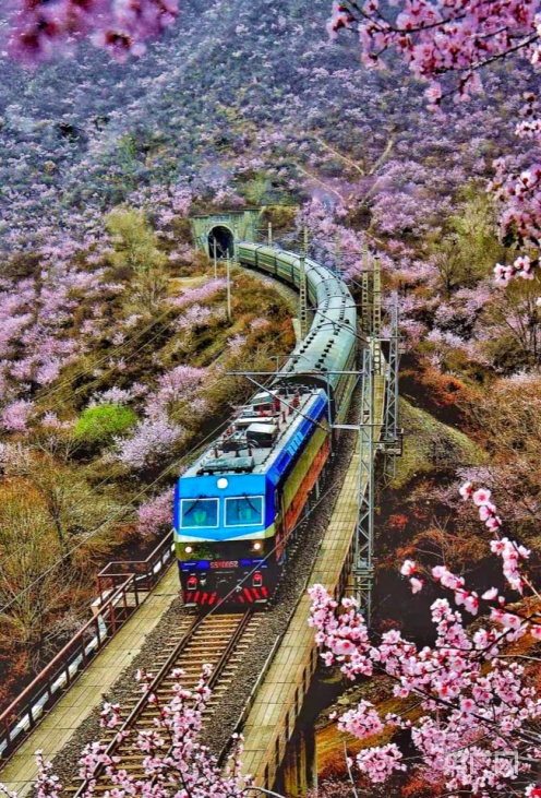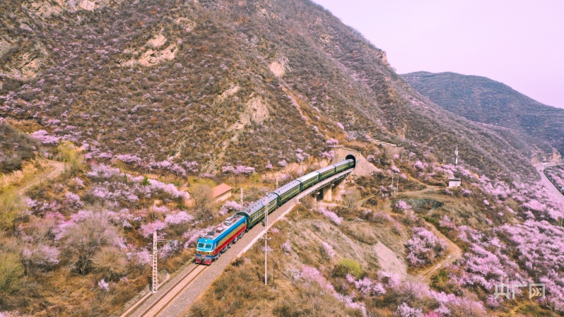 央廣網蘭州4月2日消息 (記者 邸文炯 通訊員 王紅剛 孫淑霞)近日,甘肅省崇信縣峽門寶中鐵路華亭市安口窯站附近的山上桃花盛開,花香四溢、如煙似霞?;疖噺纳街械乃淼来┬卸^,駛向一片春光燦爛。