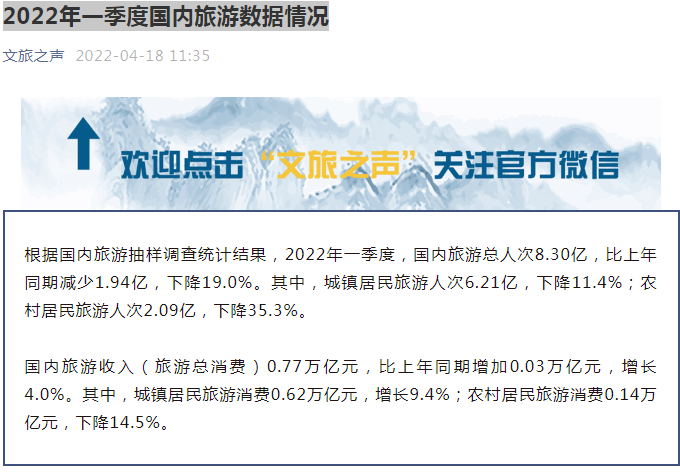 文化和旅游部表示,根據(jù)國內(nèi)旅游抽樣調(diào)查統(tǒng)計(jì)結(jié)果,第一季度國內(nèi)旅游收入(旅游總消費(fèi))0.77萬億元,比上年同期增加0.03萬億元,增長(zhǎng)4.0%。其中,城鎮(zhèn)居民旅游消費(fèi)0.62萬億元,增長(zhǎng)9.4%;農(nóng)村居民旅游消費(fèi)0.14萬億元,下降14.5%。