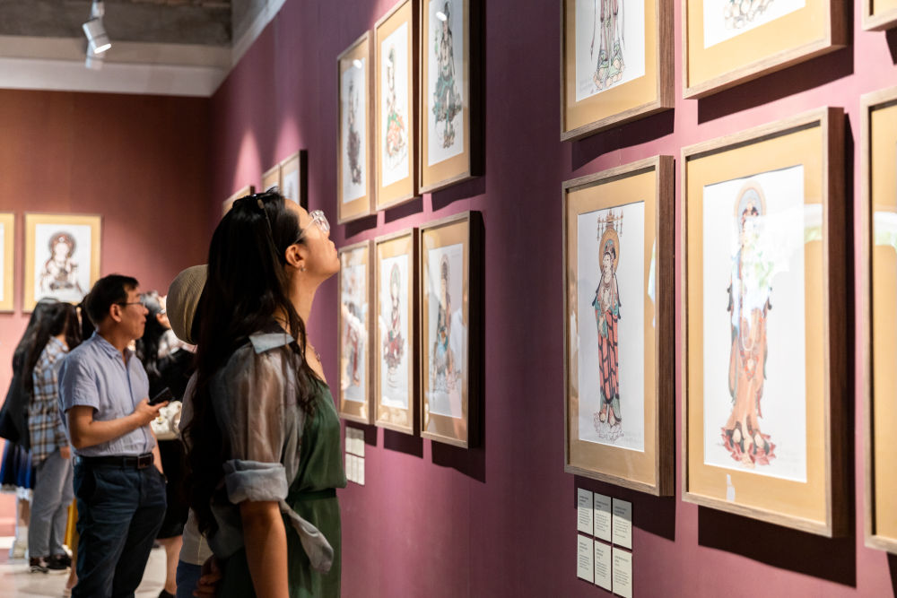 此次展覽分為菩薩服飾、天人服飾、世俗人物服飾等板塊,展品包括畫稿、藝術(shù)再現(xiàn)服飾、創(chuàng)新設(shè)計(jì)服飾、文創(chuàng)產(chǎn)品等,較為全面地反映了唐代服飾的面貌。