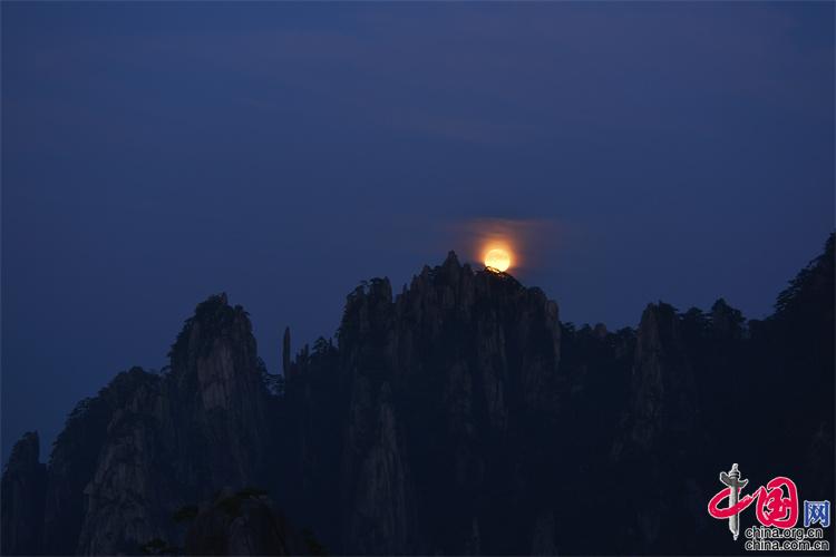 9月10日,中秋之夜,7點(diǎn)左右月亮如約而至,躍出地平線,穿過(guò)群峰峻嶺,露出了它靚麗的臉龐。剛出的時(shí)候,月亮和初升的太一樣是帶紅色的,隨著慢慢的升起越來(lái)越明亮,這時(shí)的黃山在月光照射下變得很清新。(姚育青)