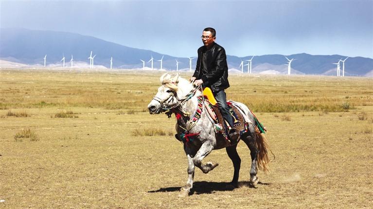 驅(qū)車向草原腹地進發(fā),遠遠就能看見有人在馴馬。馴馬者房利軍和他的坐騎“尕青”仿佛“人馬合一”,同呼吸、共步調(diào),一遍遍練習(xí),像走,更像飛。這便是傳說中的走馬文化,和跑馬的加速度不同,走馬不管是走還是跑,都是快步勻速,短途速度快,長途耐力強,騎乘平穩(wěn),姿態(tài)優(yōu)美,觀賞性強。在牧區(qū),走馬實用性強,深受當?shù)厝藲g迎。曾有專家稱,“馬踏飛燕”的“馬”即為走馬。每天,和武威天祝一山之隔的這片草原,都與房利軍有關(guān),在這里,他專心馴馬,而他的500只羊則在一旁撒歡。尤其從高空俯瞰,草原牧羊的畫面甚是壯觀??赐犟Z馬,房利軍騎馬帶路,采訪車沿著馬道回到了“家”。