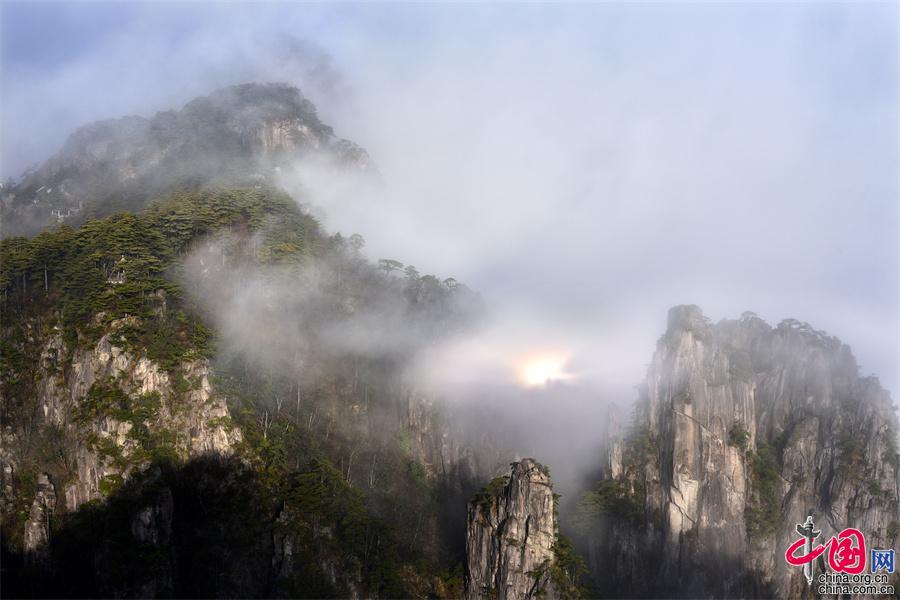 在黃山風景區(qū)的始信峰,群峰中時而云海翻騰,時而霧靄朦朧,時而艷陽高照,還出現(xiàn)了佛光奇觀,勾勒出一幅幅黃山獨有的勝景。