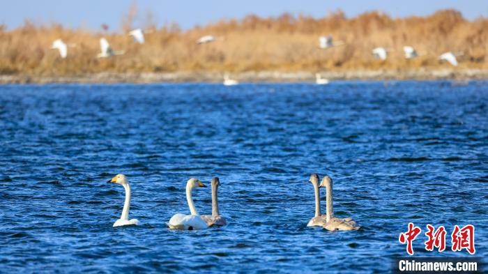 中新網(wǎng)烏魯木齊11月15日電(年磊)11月14日,位于新疆維吾爾自治區(qū)巴音郭楞蒙古自治州博湖縣境內(nèi)的博斯騰湖白鷺洲迎來大批天鵝,它們?nèi)宄扇航Y(jié)伴游弋,嬉戲追逐,優(yōu)雅的身姿成為博斯騰湖一道靈動的風(fēng)景線。