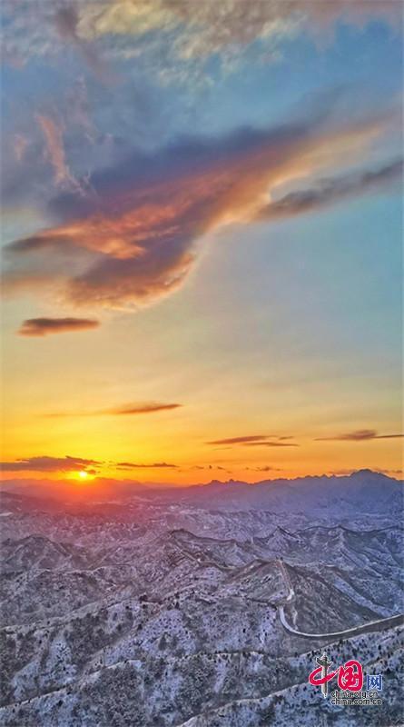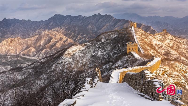 皚皚白雪覆蓋長城內(nèi)外,銀裝素裹金山嶺氣勢磅礴。