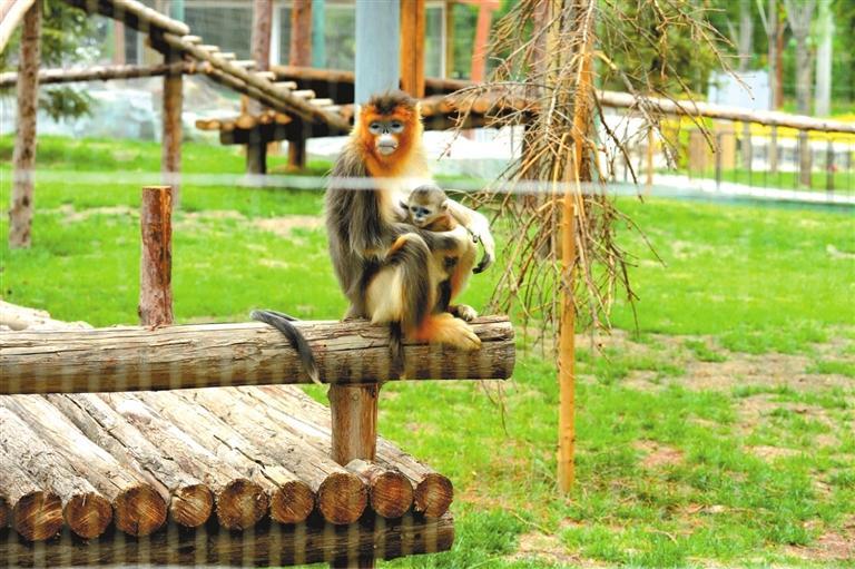 在珍稀動物區(qū),同樣也是4月份出生的兩只小金絲猴好奇心很強,總想離開媽媽的懷抱去闖蕩世界,而猴媽媽則小心翼翼觀察周圍的環(huán)境,稍有響動就把猴寶寶攬入懷中,“寶媽”氣十足。