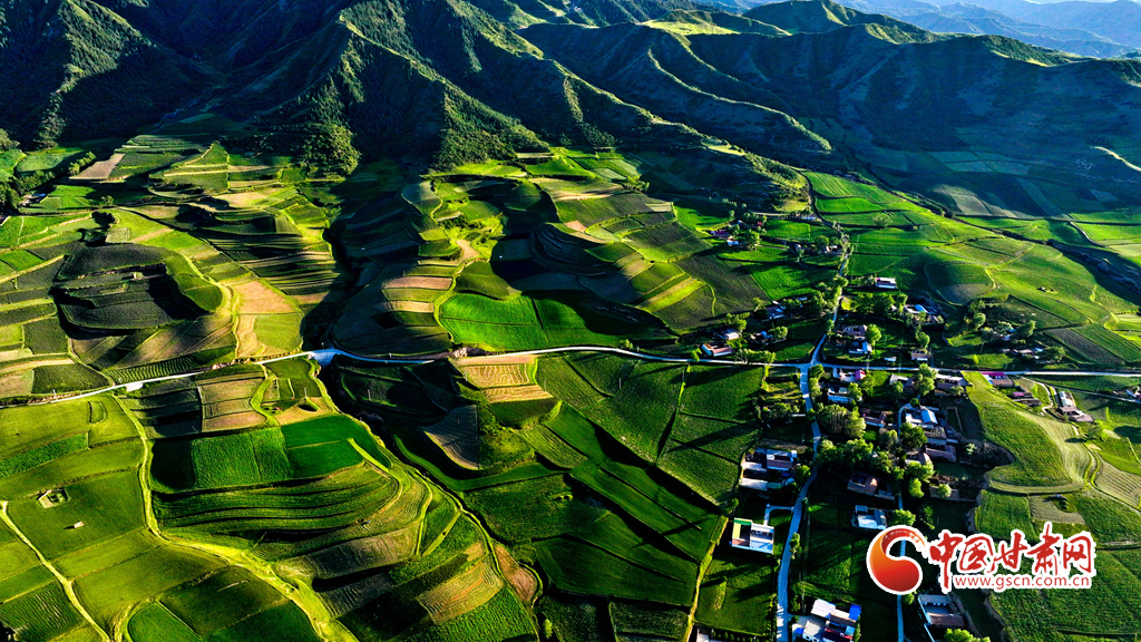 夕陽映襯下的祁連山北民樂縣豐樂鎮(zhèn)易家灣村,綠油油的莊稼生長(zhǎng)旺盛,林木蓊郁層林盡翠,呈現(xiàn)出生機(jī)勃勃的景象,猶如“巨幅綠毯”。