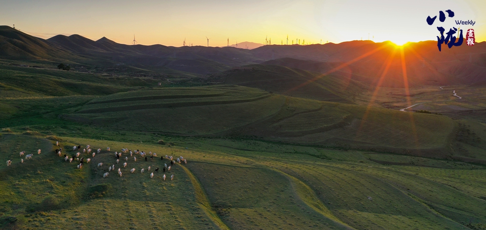 極目遠(yuǎn)望,隨著山坡緩緩蔓延開來的草原,被溫柔的落日余暉浸染,變得美不勝收,盡收眼底。