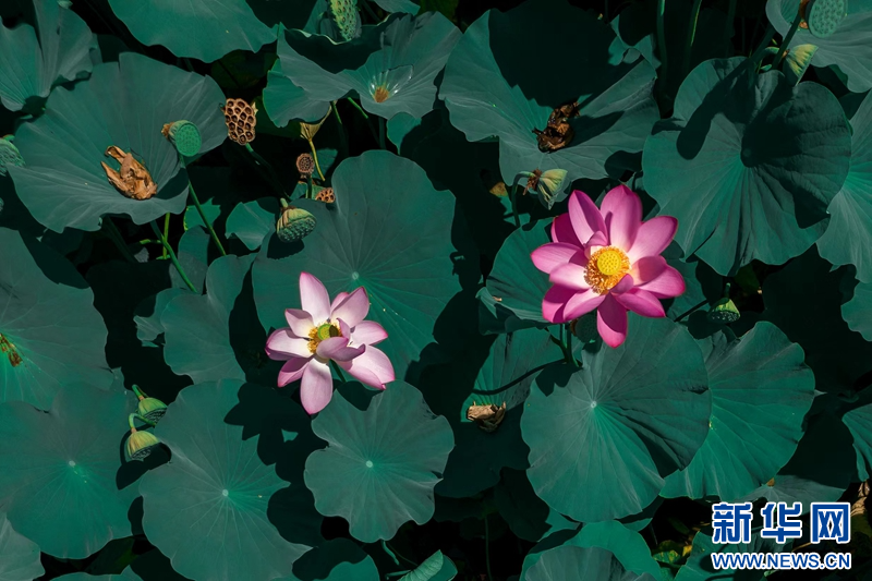 近日,在甘肅省白銀市白銀區(qū)水川黃河濕地公園,滿池荷花嬌艷、荷葉青翠,藍天、碧水、嬌花、翠葉構(gòu)成了一幅秋日美景圖。新華網(wǎng)發(fā)(郭宏 攝)