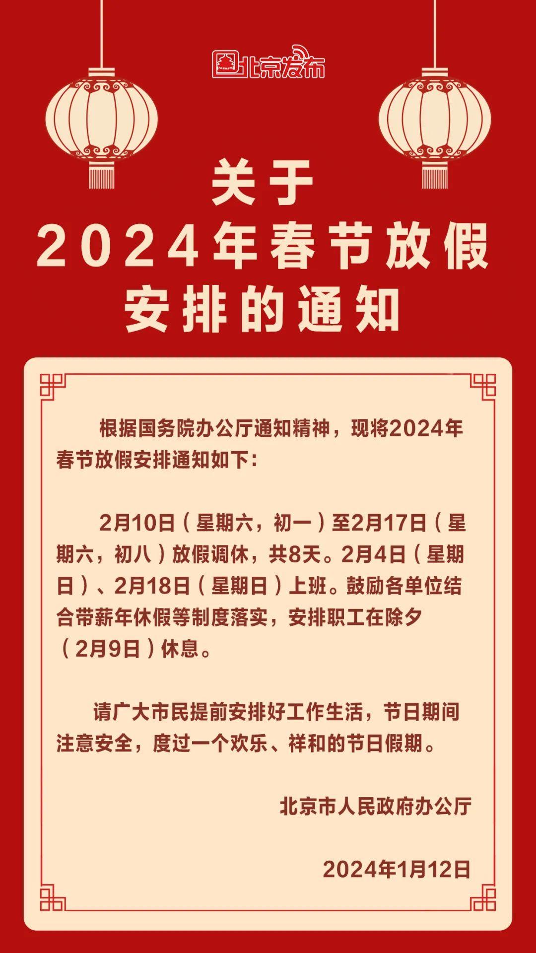 1月12日,北京市人民政府辦公廳正式發(fā)布關(guān)于2024年春節(jié)放假安排的通知。通知稱(chēng),2月10日(星期六,初一)至2月17日(星期六,初八)放假調(diào)休,共8天。2月4日(星期日)、2月18日(星期日)上班。