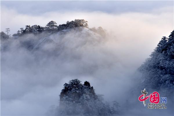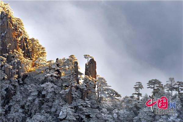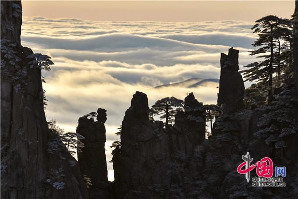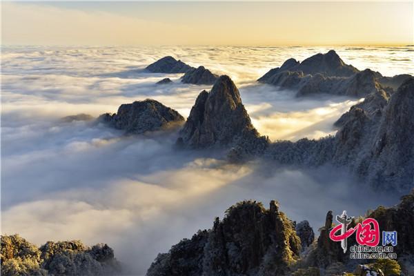 冬天的黃山絕美之處莫不過于雪景、霧凇、日出、云海同時出現,1月5日雪后早晨一輪紅日冉冉升起,在陽光的照耀下,放射出萬丈光芒,在群峰間、奇松怪石上散發(fā)著金燦燦的光彩,給冬景增添神奇的色彩,美輪美奐宛如油畫。
