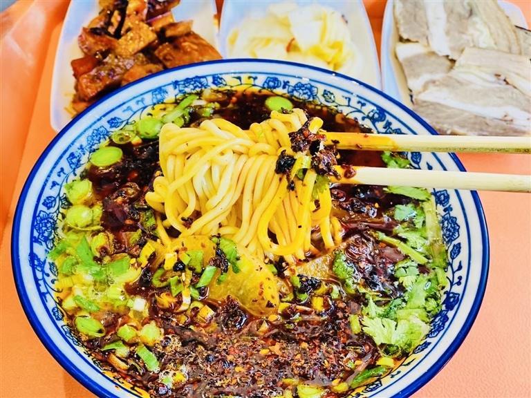 三月末的蘭州,天色尚未亮,蘭州城區(qū)千余家牛肉面館已開門營業(yè)。不少市民就來趕“頭鍋”,喚醒一天的精氣神。早上七八點(diǎn),面館的人越來越多,大家排著隊(duì),但并不需要等很久,稍等片刻牛肉面便出鍋了,熱氣騰騰,香氣四溢,吃起來更是回味無窮:面條筋道、湯汁濃郁。吃罷面,吹開面湯上紅紅的辣椒油,喝一口湯,滿福滴很!