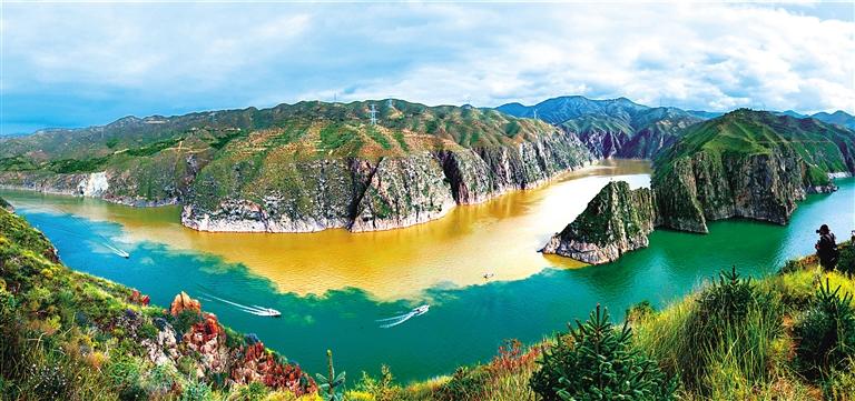 提及永靖劉家峽,第一反應(yīng)就是一個成語——“涇渭分明”。受上游降水影響,洮河河水比較渾濁,在與黃河交匯處劉家峽水庫的清波“相遇”時,形成一清一黃兩股水流,河流呈“Y”字形交匯。交融卻不滲透,加上河中的石山,猶如兩條巨龍游戲于此,在當(dāng)?shù)剡@一景象也被稱為“二龍戲珠”。初秋時節(jié),來自全國各地的游客站在黃洮交匯觀景臺上,感受這份來自大自然的震撼與壯美,從高處遠眺入河口,“黃河清,洮河黃”,可謂“涇渭分明”,景色極為壯觀。