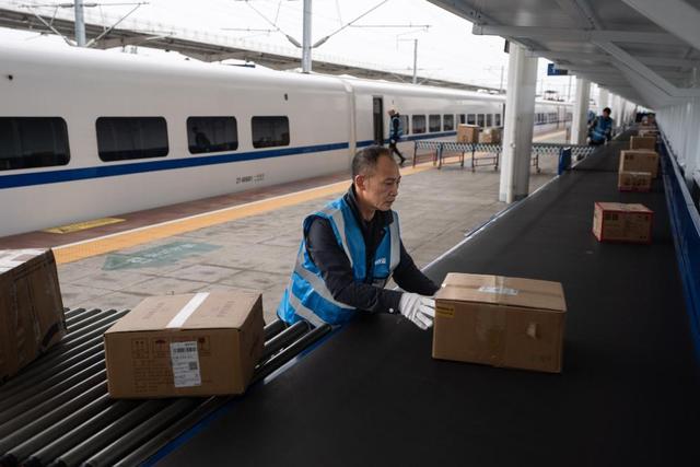11月11日,在成都雙流西站,工人將電商快件從動車上搬運下來。新華社記者 江宏景 攝
