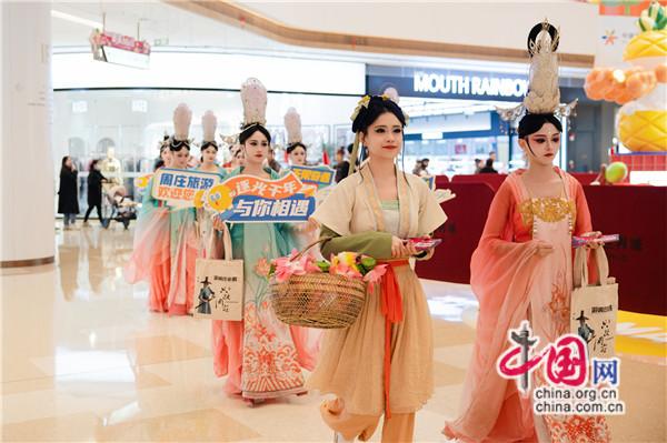 《只此周莊》劇目女主“桃兮”身著華麗的宮廷霓裳,攜宮廷舞姬、樂姬等進(jìn)行了一場(chǎng)別開生面的互動(dòng)巡游。“宇航員”“俠客”、明朝富商“沈萬三”等劇中人物走出劇場(chǎng),與市民合照;宮廷器樂演繹、“入畫”舞蹈、英雄出征等節(jié)目從劇場(chǎng)演到商場(chǎng),將宋代的繁華展現(xiàn)得淋漓盡致,市民們沉浸觀演,享受跨時(shí)空的文化盛宴。