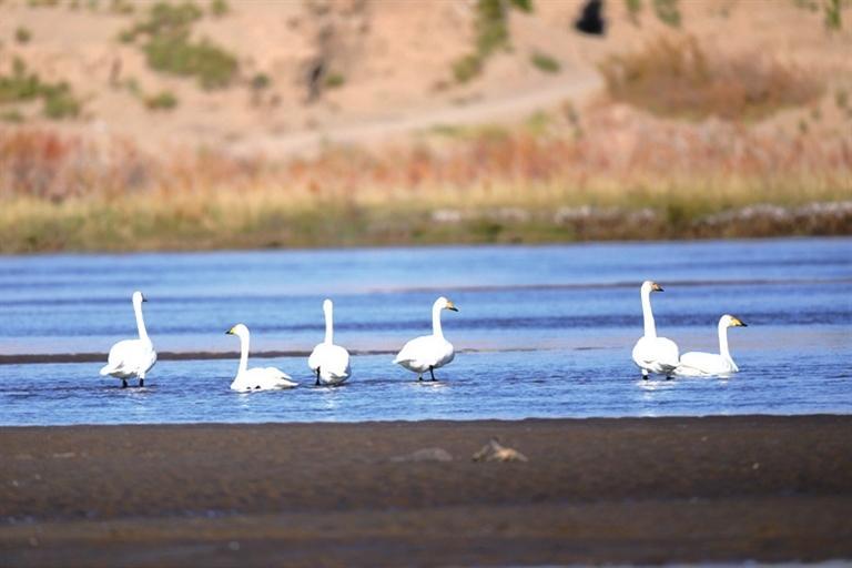 近日,高臺縣黑河濕地多次監(jiān)測到大天鵝種群,它們的翩翩降臨,標(biāo)志著天鵝一年一度的越冬之旅正式開啟。 大天鵝是雁形目鴨科天鵝屬鳥類,又稱黃嘴天鵝,全身潔白,僅頭稍沾棕黃色;喙黑色,上喙基部黃色,喙端黑色;跗跖、蹼、爪也為黑色,是國家二級保護(hù)動物。天鵝對棲息地的選擇極為苛刻,它們的到來是高臺縣黑河濕地生態(tài)環(huán)境質(zhì)量優(yōu)良的有力證明。
