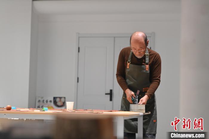 11月23日,甘肅省蘭州市楊樹(shù)珍剪紙工作室內(nèi),工匠名師劉金碌制作剪紙漢服作品的金屬帽邊。中新社記者 李亞龍 攝