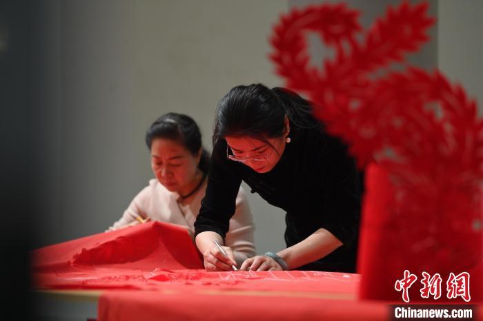 11月23日,甘肅省蘭州市楊樹(shù)珍剪紙工作室內(nèi),楊樹(shù)珍團(tuán)隊(duì)成員制作剪紙漢服作品。中新社記者 李亞龍 攝