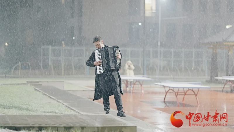 鏡頭中,在蘭州大學(xué)榆中校區(qū),手風(fēng)琴聲伴隨著雪花,一位同學(xué)在雪中輕輕擺動(dòng)著身體,引得過路的同學(xué)駐足欣賞。