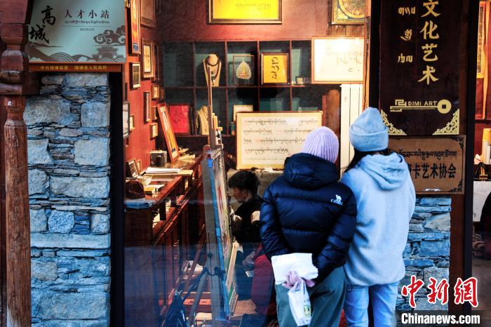 12月22日,在勒通古鎮(zhèn)的“唐卡館”,一位畫師繪制唐卡吸引游客駐足觀看。中新社記者 薛蒂 攝