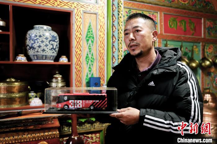 12月22日,藏文書法家昂旺曲批展示收藏的車模型。中新社記者 薛蒂 攝