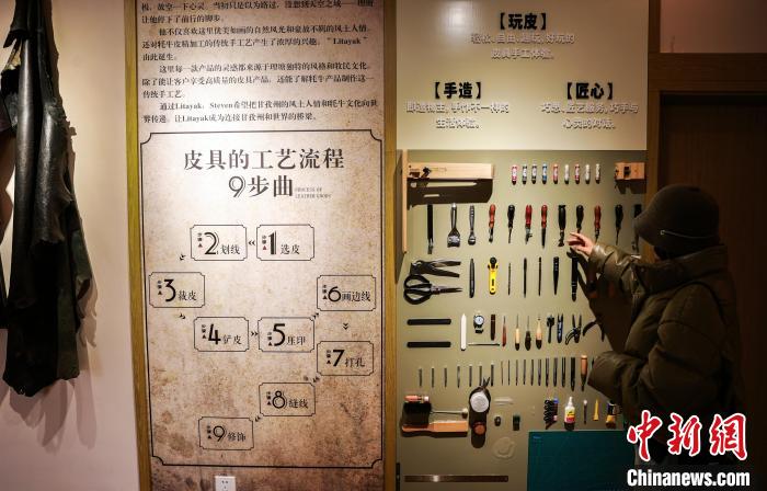 12月22日,在勒通古鎮(zhèn)的一家皮具店內(nèi),游客被掛在墻上的工具所吸引。中新社記者 薛蒂 攝