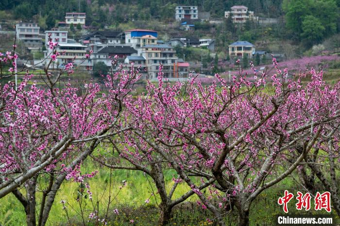 3月15日,在廣西田林縣浪平鎮(zhèn)浪平村,滿樹桃花與錯(cuò)落村舍相互映襯。黃數(shù)情 攝