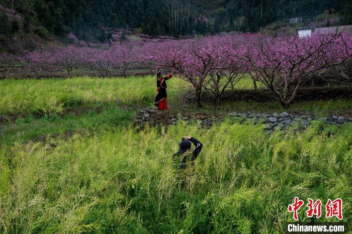 時(shí)下正是桃花盛開的時(shí)節(jié),在廣西田林縣浪平鎮(zhèn)浪平村,村民種植的桃花競相綻放。滿樹繁花與錯(cuò)落村舍相互映襯,還有樹旁玩耍的孩童、樹下勞作的村民,動(dòng)靜交織,構(gòu)成一幅絕美的田園春景圖。圖為3月15日,在廣西田林縣浪平鎮(zhèn)浪平村,村民在桃樹下勞作。黃數(shù)情 攝