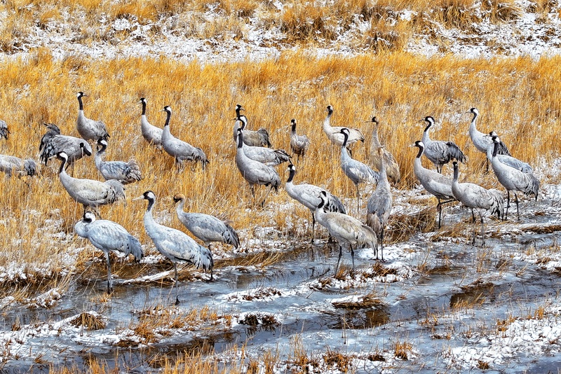 在嘉峪關草湖國家濕地公園休整的灰鶴(央廣網(wǎng)發(fā) 嘉峪關市融媒體中心供圖)