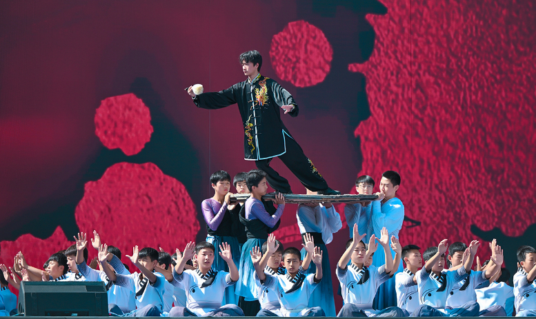 活動(dòng)伊始,開(kāi)場(chǎng)片《歡迎乘坐崆峒號(hào)》以“環(huán)西部火車(chē)游·崆峒號(hào)”平?jīng)雎糜螌?zhuān)列為靈感,通過(guò)跨時(shí)空對(duì)話(huà)串聯(lián)崆峒山古今脈絡(luò),拉開(kāi)活動(dòng)序幕?,F(xiàn)場(chǎng),街舞與崆峒武術(shù)團(tuán)體合作的《武韻崆峒》展現(xiàn)武術(shù)與現(xiàn)代肢體藝術(shù)新生機(jī);笛子演奏與武術(shù)冠軍聯(lián)袂呈現(xiàn)的《崆音劍影》打造“可聽(tīng)的武術(shù)”沉浸式體驗(yàn);30人陣容的江蘇武協(xié)女子太極拳團(tuán)體演繹《鶴起崆峒》,詮釋武術(shù)新功用;國(guó)風(fēng)歌手與秦腔表演藝術(shù)家合作的《秦韻長(zhǎng)歌》,展現(xiàn)“武戲同源”的多元魅力。