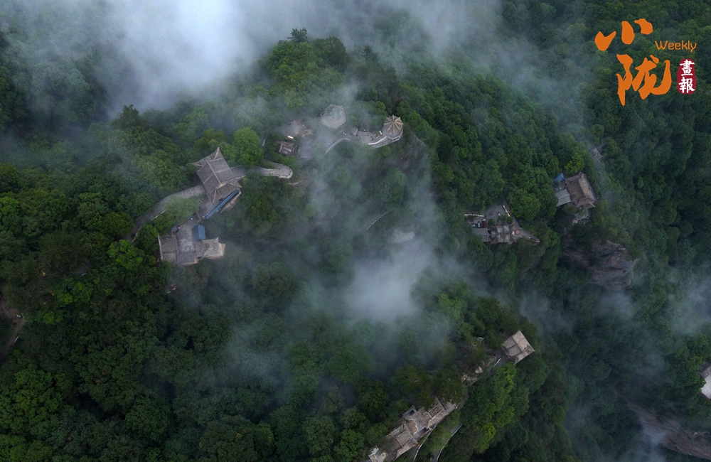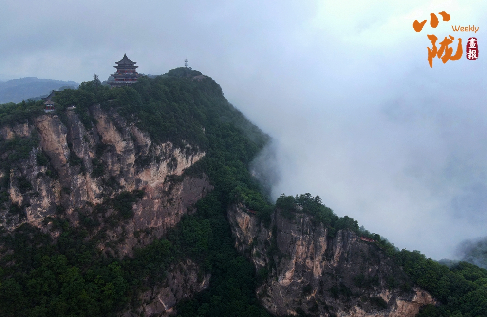 云霧繚繞,山水與寺廟隱現(xiàn),營(yíng)造出神秘且令人向往的視覺(jué)效果。站在半山腰,背靠懸崖,深邃不可見(jiàn)底,不禁生出“山登絕頂我為峰”的豪情。然而,世間萬(wàn)物,瞬息萬(wàn)變,是否成為峰巔之巔又何妨?