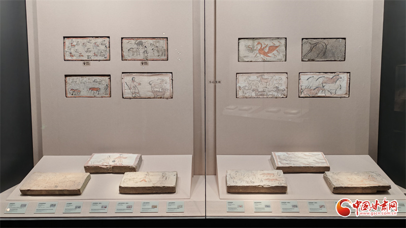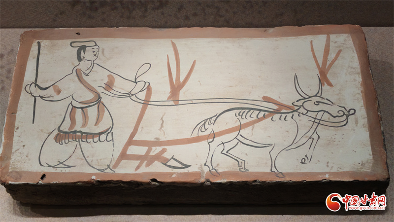 在博物館的“古冢丹青——高臺魏晉十六國時期墓葬壁畫藝術陳列”展廳里,記者看到,《二牛耕地畫像磚》生動再現(xiàn)了當時的農(nóng)耕技術:兩頭耕牛架著直轅犁,后隨的男子一手扶犁一手揚鞭,展現(xiàn)了典型的“二牛抬杠”耕作方式。《牧鹿圖壁畫磚》則描繪了古人放牧鹿群的獨特場景,為研究當時的畜牧業(yè)發(fā)展提供了珍貴資料。