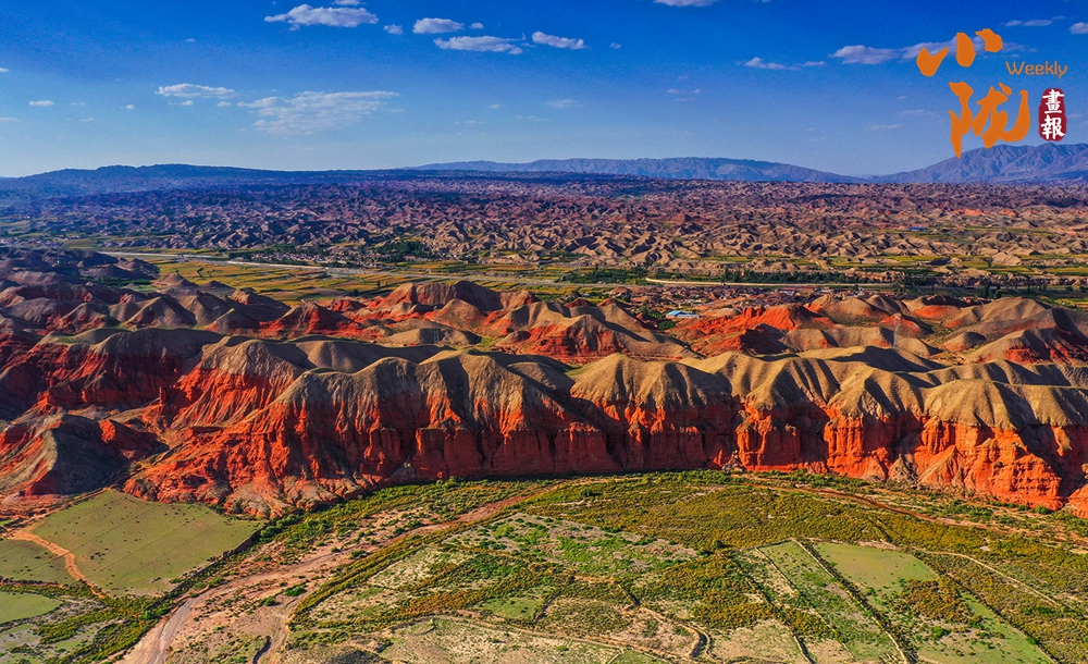 極目遠(yuǎn)眺,丹霞丘陵在廣袤的黃土高原上奔騰不息,猶如一座座火焰山。朱砂紅如烈焰燃燒,赭石黃似大地厚土,青黛綠若幽谷深潭,間或夾雜著沉穩(wěn)的灰褐,共同編織出一種難以言喻的斑斕與和諧。