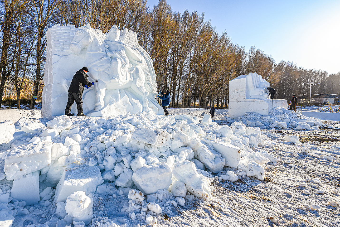 中國甘肅網(wǎng)1月13日訊 據(jù)嘉峪關(guān)日報報道(融媒體中心記者 李巍 攝)揚鏟塑造型,落刀雕精彩。1月10日,懸壁長城腳下,《昭君出塞》《九尾靈狐》《喜財神》等雪雕作品,在匠人們的精雕細琢中漸漸揭開“面紗”。