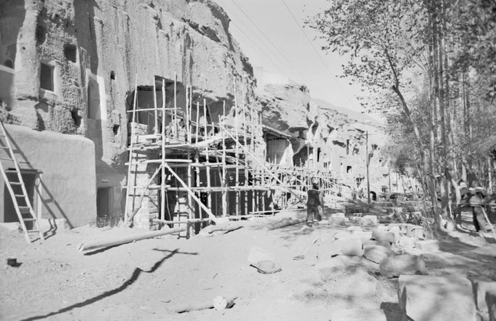 工作人員對莫高窟部分洞窟進(jìn)行加固施工(1964年7月8日攝)。敦煌研究院供圖