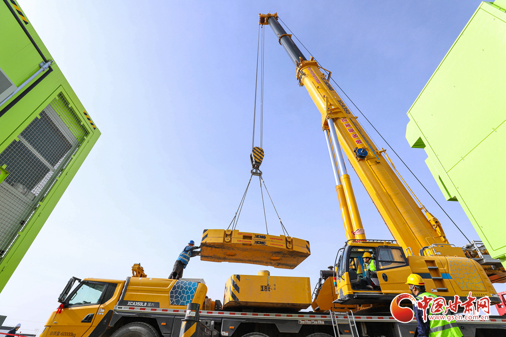 3月19日,張掖市山丹縣東樂灘上,工程建設(shè)者們正在進(jìn)行儲能電站項目電池倉吊裝前的準(zhǔn)備。